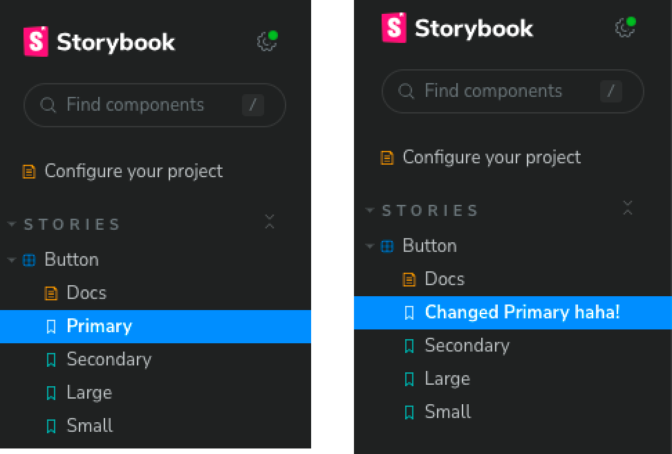 Similar to the aforementioned title story property, Storybook automatically generates this. Like the title property, we can override this by providing a name for the story like so: